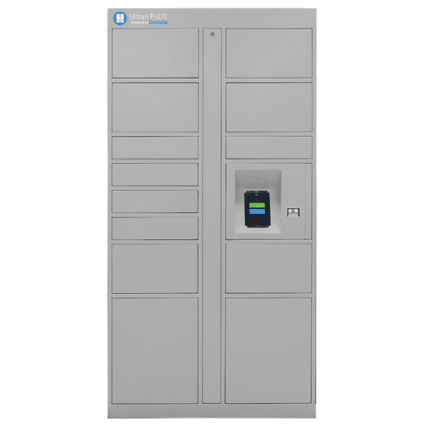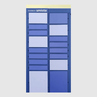 Smiota’s main console unit has 13 lockers (five small, six medium, and two large) along with a built-in control center.