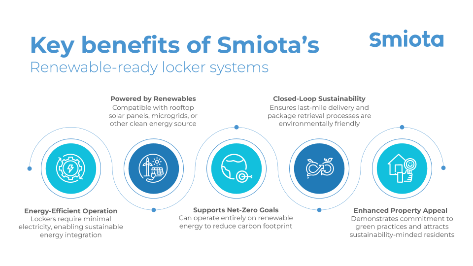 By combining low-energy design with renewable energy integration, Smiota lockers help properties achieve a truly eco-conscious delivery ecosystem that balances efficiency, convenience, and environmental responsibility.
